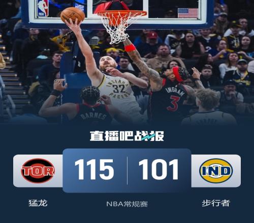 比赛开始,猛龙反客为主打出11-2开局,步行者进攻端找不到手感,随后猛龙全队多点开花,打出小高潮直接拉开20分以上领先,次节步行者替补上来连续三分追分,但迪克里突外投单节上双再回应,猛龙始终保持住20分左右领先。下半场,步行者接连外线发炮追分,但猛龙还能回应,西亚卡姆苦苦支撑,猛龙还是保持住十几分领先,末节猛龙很快犯满,西亚卡姆带队轰出18-6攻击波追到差6分,莺歌站出来关键两记三分,巴恩斯里突外投,二人联手10-2杀死比赛,最终猛龙115-101力克步行者。