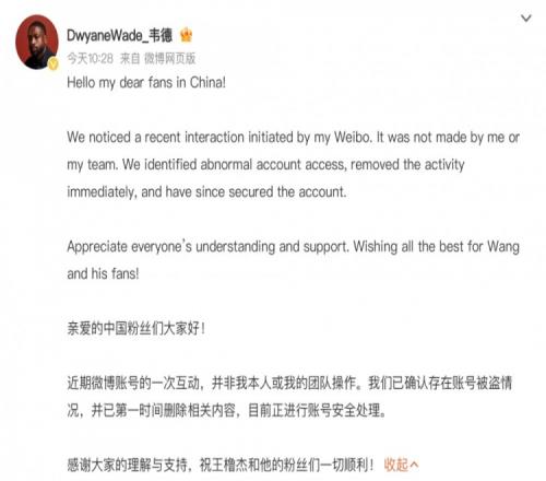 今天,韦德的微博账号发布声明,此前的异常行为是被盗号了:“亲爱的中国粉丝们大家好!近期微博账号的一次互动,并非我本人或我的团队操作。我们已确认存在账号被盗情况,并已第一时间删除相关内容,目前正进行账号安全处理。感谢大家的理解与支持,祝王橹杰和他的粉丝们一切顺利!”
