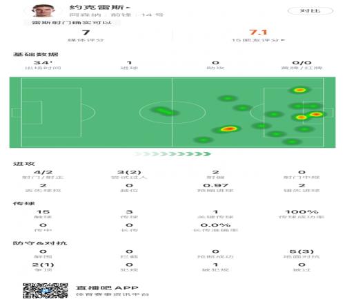 约克雷斯半场数据:4射2正打进1球,2次错失进球2次丢失球权