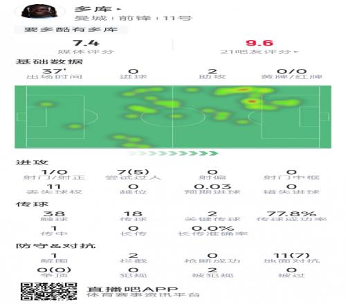 体育播报1月29日宣 在本轮欧冠曼城对阵加拉塔萨雷,多库助攻双响,以下为他在本场数据: