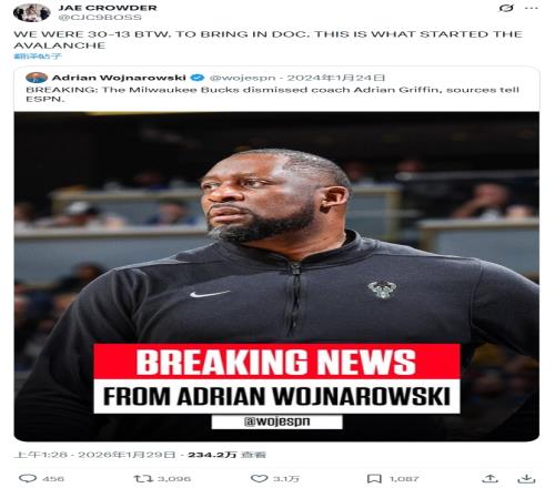 体育播报01月29日宣 前雄鹿球员杰·克劳德转发了Woj旧日爆料雄鹿换帅的推文。