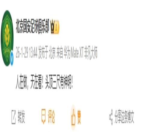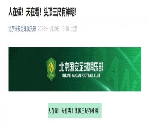 体育播报01月29日宣 北京国安官博、公众号发文:人在做,天在看!头顶三尺有神明!